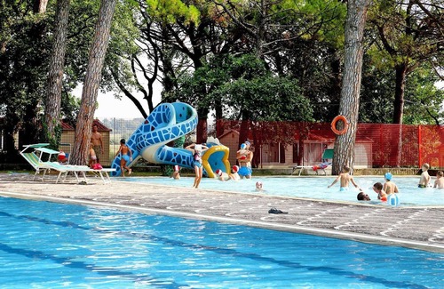 On the wooded grounds of a 50-hectare natural park on the Grado Lagoon: holiday resort for the whole family. Young and old can refresh themselves in the 300 square meter pool, with the water slide providing the fun factor. If you prefer to swim in the lagoon, you can easily reach the lagoon's flat sandy beach via a pedestrian crossing. The accommodation types A-E (1-5) are near the reception, type F-H (6-8) are near the beach. The holiday complex borders directly on the gently sloping sandy beach and is only five kilometers from Grado's old town. You can easily reach the lagoon city by car via a causeway. In the beautiful pedestrian zone you will find countless shops, restaurants and bars that provide a lot of variety. The following applies to the system: - 185 residential units - Reception - Restaurant - Pizzeria - Supermarket - Bar - Washing machine (for a fee) - Tumble dryer (for a fee) - Animation (seasonal, July and August) Activities nearby: A well-signposted cycle path runs directly past the complex, so you can explore your surroundings from a different perspective at a slower pace. Nearby is the famous archaeological site of Aquileia, which you should definitely visit. The place was one of the most important cities of the Roman Empire and is one of the largest archaeological sites in Italy. Amateur ornithologists get their money's worth in the Valle Cavanata and Foci dell'Isonzo nature reserves. A day trip to nearby Venice is also possible; it's best to take the train there; You can reach the lagoon city in about an hour and a half and have no parking problems. Other destinations for day trips are Trieste, Udine, Pordenone, Cividale and Gorizia