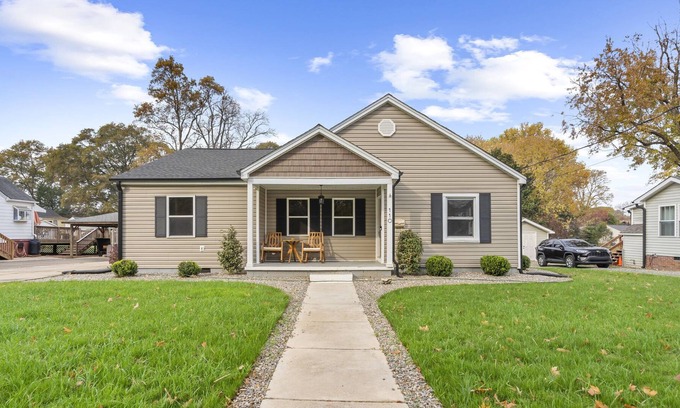 Historically renovated home on 3/4 acre lot with a large fenced in back yard with a heated swimming pool. Home is within a half mile of Main St and a quick 10 minute walk to restaurants, entertainment, parks and shopping. There are tennis courts, pickle ball courts, basketball courts and a play ground a block away from the home. 4 bedrooms, 2.5 bathrooms. 3 rooms with queen beds, primary room with king bed, jetted tub and full bathroom. $200 per week to heat the pool extra fee. $100 fee for a pets with approval.