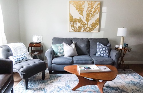 Open-concept floor plan. Living room has a sleeper sofa couch and we have additional bedding in the closet upstairs if someone needs it as a bed.