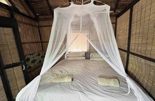 All our lodging is tucked away behind a dune, giving you complete privacy and weather protection. Cabana 3 has 2 bedrooms, each with a king-sized bed with hotel-quality bedding. Rooms are equipped with mosquito nets, and storage space for clothes and fans. There is a large, shared bathroom right across from the cabana (Separate for men and women).