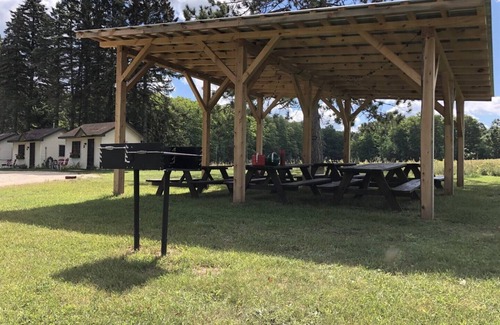 Outside: Large grassy areas in the back and center of the property, picnic area with tables and charcoal grills located at each cabin. Community Fire pit with log seating (firewood available onsite for small charge). In the warmer months, horseshoes, croquet and other vintage yard games are just steps away from your cabin.