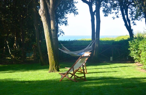 The property features a large private fenced garden with a beautiful lawn, with sun beds, hammocks and deck chairs. The garden, surrounded by a wood, enjoys a fantastic sea view towards Monte Cristo island.