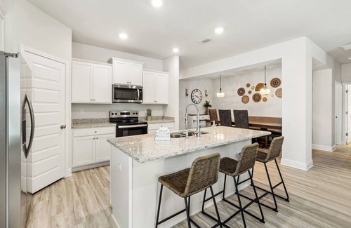 The kitchen is fully stocked, plus a grill. There is a fully laundry room with a washer and dryer.