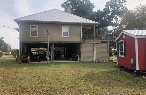 The cabin is located on approximately one acre of land along with the main camp and has playground equipment, including a zip-line for the kids, a slide and a merry-go-round. Out at the end of the levy is a fishing pier with an upper deck. The fishing pier is available. Usually there are several crab traps on the deck and can be baited and thrown in (always throw with the bait down) or you can use string with bait. It has a sink with cold water only. The upper deck is a wonderful place to view sunsets over the marsh or to fish and sunbath.