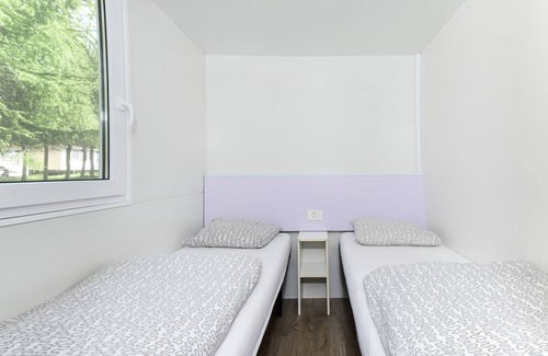 Enjoying space, comfort, and coziness in the Czech Republic!Looking for a nice campsite in the Czech Republic with all the comforts of home? Then you're in the right place with our spacious mobile home with three bedrooms - perfect for a holiday with six people!With 32 m² of living space and three separate bedrooms, this mobile home immediately feels comfortable. You sleep in an extra-long double bed of 200 cm, and in the other rooms you'll find four delightful single beds of 200 x 90 cm. The bathroom is also extra spacious, with a nice shower to start the day fresh..Self-cooking? No problem! The kitchen is fully equipped with a refrigerator, gas stove, crockery, cutlery, knives and cutting boards. This way, you can decide for yourself whether you go out to eat or make something delicious in your own mobile home.The location is ideal: close to the playground, swimming pool and restaurant. All places are car-free and surrounded by greenery, which provides tranquillity and a child-friendly environment.