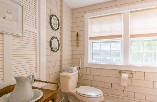 Bathroom #1 is a full bathroom with shower on the main level with unique decor - shingles and shutters - painted in antique white.