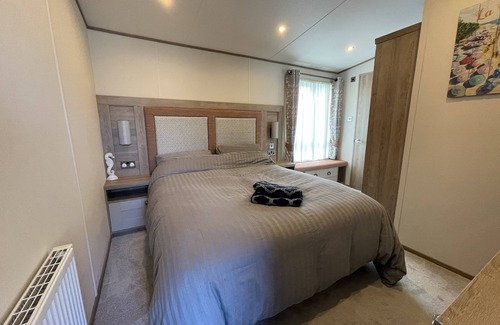 This single-storey lodge has two bedrooms including a king-size with en-suite shower, and a twin, along with a shower room and an open-plan living space with kitchen, dining area and sitting area with electric flame-effect stove. Appliances include a gas oven and hob, a microwave, fridge/freezer, washing machine and hairdryer, and for entertainment there is a TV, WiFi and a selection of books, as well as on-site facilities. Outside, there is off-road parking and wraparound decking with a barbecue and furniture. Fuel, power, bed linen, towels and a highchair are all provided. Sorry, no pets and no smoking. You can find a shop, pub, beach and restaurant on the site too. Make memories with your family at Caravan.