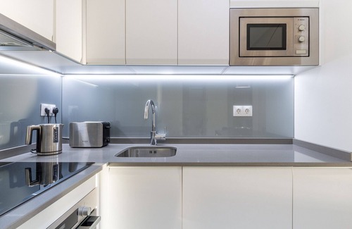 This elegant and modern apartment offers you an unforgettable experience with panoramic sea views from its bright and well-designed spaces. The living-dining room is a comfortable and cozy space, with a perfect sofa for relaxing, a Smart TV for your entertainment and high-speed wifi, ideal for both working and enjoying your favorite series and movies. The dining table, with capacity for 4 people, allows you to enjoy pleasant meals with the sea as a backdrop.