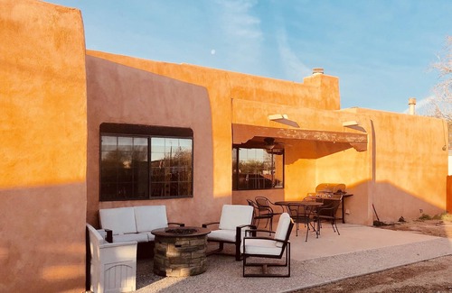 My vacation home is a full-time dedicated home, I don’t live in it but it was created as a separate property and shares a private road with our backyard and my neighbor who is a renown bronze monument sculptor artist. The whole property is a very serendipitous arrangement. You will feel the warmth the minute you arrive and feel as though you were meant to be there. Being located in the north valley of albuquerque inserts you into former farmland and because we are close to the Rio Grande river you will frequently see hot air balloons flying on most mornings just before or after sunrise so be sure to make a cup of coffee and walk up the stairs located 40 feet from your front door and up to the Sky Deck to watch the balloons and in the evening grab a glass of wine to go back up on the deck to watch our unbeatable sunsets. Take a walk past Our Lady of Guadalupe Church located behind the property to have lunch breakfast or dinner at Flying Star Cafe 12 minutes to the north. That funky looking building in the photos is the chicken coop so feel free to grab fresh eggs.