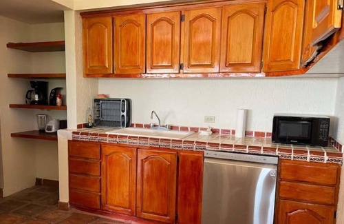 This property hosts four rentals, 2 quaint little studios, that sleep up-to four people, 2 - 2 bedroom suites that can sleep six people. Over looking the Bay of La Paz with stunning, sunrises and sunsets. You will thoroughly emerge yourself in this beauty of the landscape. The common areas have a 55' solar heated pool, 3 Pickle-ball courts, basketball, barbeque area, Palapa bar, a Palapa area for relaxing and hot tub. Bring the whole family to this great place with lots of room for fun.