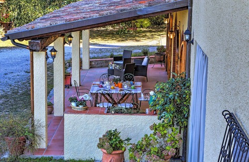 The park of Casale Le Conce extends over a total area of about 2000 sq m on two terraces, of which the lower one is occupied by the pool and a large expanse of lawn brightened by typical shrubs and rose bushes. From the gate with independent entrance, you come to the parking area near the entrance to the house. Outside the French windows is the large portico arranged with seating area, dining table and a stone barbecue. In front is the garden with manicured lawn, fruit trees and potted plants. In an adjoining annex is the laundry room.Please notice that photos are taken in spring, therefore flower blossoming, and the colours of the gardens' grass could be different at the moment of your arrival at the villa.