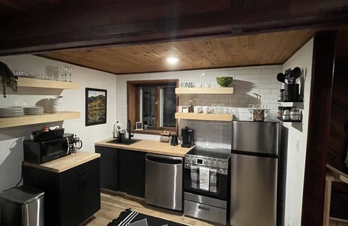 The kitchenette is efficient but powerful and packed with everything you need to make some delicious meals during your stay. There is a fridge, gas stove and oven, microwave, toaster, Keurig coffee maker, drip coffee machine, French press coffee (we like coffee) mixer, kettle, small blender, waffle maker, rice maker, small crock pot and more! There are plates, cups, bowls, coffee mugs, flatware, knives, spices and many cooking utensil you can think of. We provide some ground coffee (regular and decaf), instant cream, and sugar.