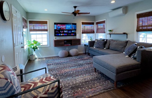Our urban guesthouse boasts vintage charm and modern amenities, with a spacious backyard perfect for relaxing. The cozy living room features a comfortable sofa and TV for streaming your favorite shows, Netflix provided. The kitchen has everything you need to cook meals at home. The bedroom features a king-sized bed, while the bathroom has a walk-in shower and fluffy towels. Outside, a large backyard with a patio area perfect for dining with propane BBQ. Corn Hole & Board Games.