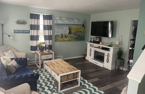 This is a townhouse apartment located steps away from Miller’s Ferry, on Catawba Island. About 100 steps from the Ferry property and about 200 steps to the shore! This is a quiet location within a triplex. There are two upstairs bedrooms with new floors upstairs and downstairs. The upstairs has a full bathroom and both bedrooms have TVs. Downstairs boasts a living room and adjacent half bathroom. Kitchen has a cozy sit in dining room with refrigerator, coffee maker, toaster and microwave. This year we added a washer and dryer. There is a patio area with propane grill and with table umbrella and plenty of seating.