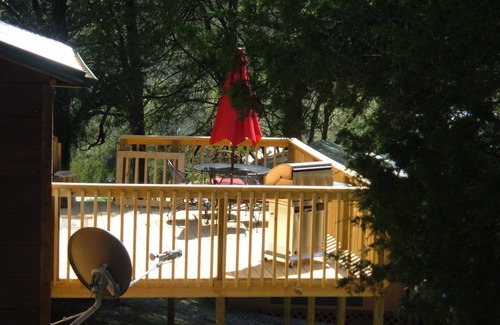 The cabin offers two bedrooms, each with its own queen size bed. The master bedroom is next to the full bathroom and a full vanity/mirror has been added to the second bedroom for your convenience, as well as a full size washer and dryer. The kitchen has been expanded and is fully equipped. The living room is newly furnished and offers a 50” HDTV, DVD, and free WIFI.