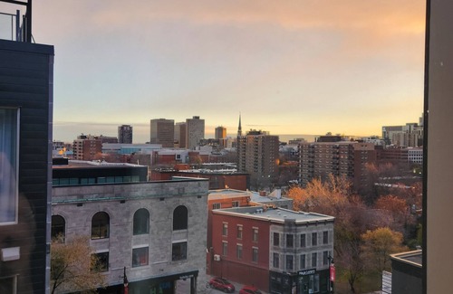 Spectacular view of Montreal from the private patio on the rooftop, and great view from the condo, enjoy your morning coffee on the balcony. Just sit by the fireplace in the winter. Sleep 4 comfortably 1 private bedroom with axqueen size bed, 1 den with a queen size sofa bed both brand new with a matress topper for exta comfort, very central located, Park your vehicle at 5 mins away at Place Des Arts, Then get around by walking or metro, close by all the fine restaurants and shoppings. In the winter you could see the ice skating ring from the suite, Just For Laugh is across the street. Internet, Laundry, the place is sanitized between guests. The building is very secured. all guest enjoyed the location. Fully equipped Kitchen, Blender. etc
