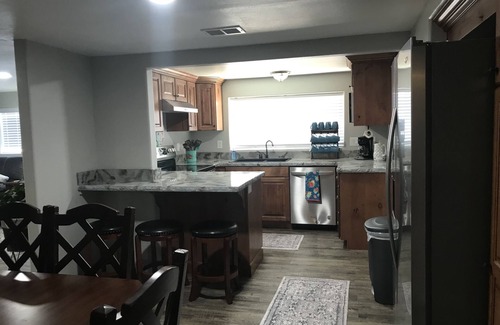 Newly remodeled home with central air and heating, with all new amenities. 5G Wi-Fi, smart TV, spacious living room area with a desk and a comfortable sectional with 3 recliners. Fully stocked kitchen and bathrooms. Comfortable beds. Great place to come home after a day of activities to relax and enjoy each others company.