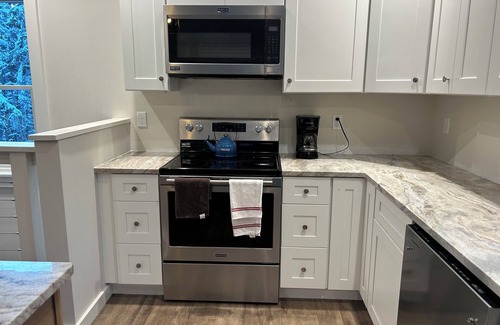 Brand new 2 bedroom home on 10 acres of beautiful wooded land. 5 beds (2 twin bunks, 1 king, 1 queen) 2 bath, granite countertops island /kitchen, 1 60” flat screen, Wi-Fi, free YouTube TV- 100+ channels, Verizon wireless cell booster, hardwood floors. wood in woodshed for the fire pit/fireplace. Less than 10 mins to Okemo/Jackson Gore, & Ludlow. 5 miles to Lake Nivyah, Magic Mt 18mile 30 min to Killington/Manchester Outlets, Located opposite mtn traffic for easy in & out This Mount Holly house boasts 2 inviting bedrooms with 1 king bed, 1 queen bed, and 1 bunk bed. The cozy atmosphere and charming decor make it a perfect retreat for guests looking to unwind and relax. With amenities like WiFi, a washer/Deyer, dishwasher disposal , your stay will be as comfortable as can be. We hope you'll enjoy your stay at our enchanting house.