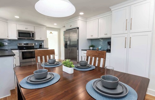 Inside, you’ll find a spacious, light-filled open floor plan with sleek furnishings, comfortable seating, and warm touches that make the home feel instantly inviting. The fully equipped kitchen is stocked with everything you need to prepare meals, from quick breakfasts before exploring town to cozy dinners at home. The dining area comfortably seats your group, and the living room features a Smart TV for movie nights after a day of adventures. For those who need to mix work with leisure, the dedicated workspace offers a quiet, comfortable spot to stay connected. Each of the three bedrooms is thoughtfully designed for restful nights, with plush bedding and plenty of natural light.
