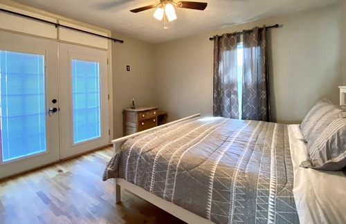 This charming, well appointed home in the quiet “college streets” awaits your arrival! 2 bedrooms up with a queen and king bed, and a self sufficient lower level offers laundry, a bedroom with a full/twin bunk, bathroom with shower, kitchenette and tv area with big screen tv. Perfect porch for morning coffee in the front, and a lovely deck with lots of room to enjoy the evenings surrounded by your peaceful yard. Fully stocked kitchen, all your linens, and extras, like games, cards, etc. provided