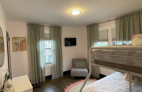 This Bellevue house boasts four inviting bedrooms. Each bedroom is thoughtfully furnished with comfortable beds, including two queen beds, two twin beds, one set of bunk beds, and one convertible chair bed. We even have a mini crib available, upon request. You'll find everything you need for a delightful stay, from the iron and hair dryer to the washing machine and AC. With two bathrooms, one of which includes a hair dryer, getting ready in the morning will be a breeze. Our place will help you feel at home while you're traveling in Bellevue.