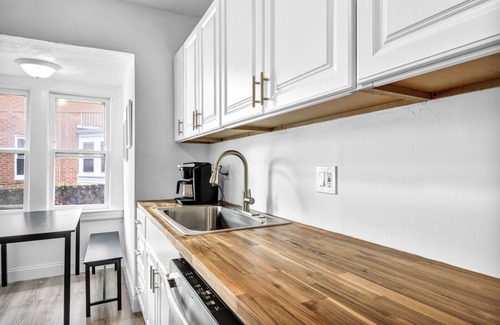 ✹ Fully Equipped Kitchen: Cook up delicious meals in the modern kitchen featuring stainless steel appliances, sleek white cabinets, and a wood-accented countertop.