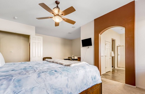 Upon entry, you'll be met with a bright interior and a feeling of welcome throughout the home. Relax and make yourself at home by resting on the plush furniture, streaming your favorite movies on the TV, or sharing home-cooked meals at the formal dining table. Hobby chefs will love preparing grand meals and on-the-go snacks in the sophisticated kitchen, equipped with a breakfast bar and all the cupboard room you'll ever need. A dedicated workspace with a desk and chair is available for remote work if you need to stay connected. Find the epitome of comfort in the main bedroom, which boasts French doors, a TV for private viewing, and a luxurious en suite bathroom with a soaking tub and walk-in shower. Kids will love hosting sleepovers in the bunk beds and hanging out in their own space with bean bags! Plus, the sofa bed provides an alternate sleeping area if needed!