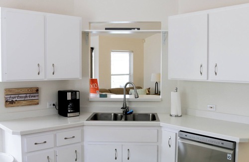 The shared solar-heated saltwater pool is maintained weekly to ensure it’s at its prime for your enjoyment and is stocked with pool towels and patio furniture for your use. The pool is shared with the duplex unit next door. Each home has its own patio space with a divider to maximize privacy, but there may be other guests in the saltwater pool itself during your stay (don’t worry, it’s plenty big enough to share). Let us know before you arrive if you intend to use it, and we’ll be sure to have it heated for you!