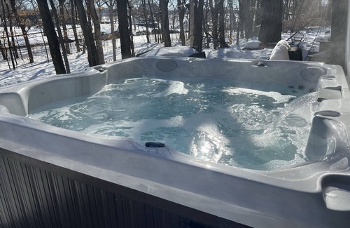 Fully equipped kitchen plus breakfast nook, LR/DR, entry parlor w/piano. Lower-level family room with comfy sectional, TV/cable/Roku, sweet sleeping nook w/queen-sized mattress . Full-sized stacked washer and dryer on that level. Walk out the back door, cross the patio and have a soak in the luscious hot tub--glorious in winter!