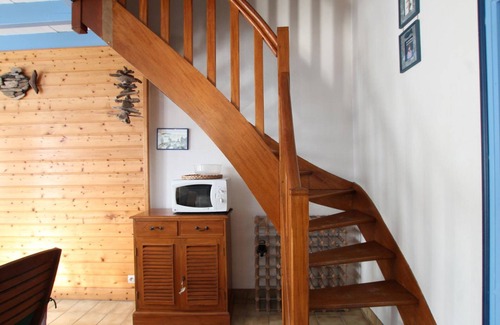 Semi-detached house to a dwelling. Living room. Kitchenette. 2 bedrooms. Sleeps 6. 1 bedroom on the ground floor with 1 bed 160. 1 bedroom upstairs communicating with 1 bed 140. 2 beds 90. 1 baby bed. Shower room. WC. Fireplace. TV. VCR. DVD player. HI-FI system. Washing machine. Dishwasher. Freezer. No sheets for hire. Cleaning service at an additional cost. Electric heating at an additional cost. Private enclosed courtyard. Picnic table. Barbecue. Parking. This old fisherman's cottage enjoys an exceptional location with its direct access to the beach. The blue shutters on the facade announce the successful marine decoration inside. A cozy cottage in cheerful colors between the D-Day beaches and the port of St Vaast la Hougue. Sun loungers. Bath towels for hire. D-Day beach 10 km away.