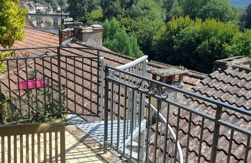 The house is on the edge of Le Bugue, overlooking the river Vezere. Only a 6 or 7 minute walk beside the river to the centre of the village. It has been tastefully renovated and furnished to maintain its original character. There is a cliff-top terraced garden accessed by a spiral staircase from the top floor of the house. It has a BBQ on the main terrace and beautiful views across the valley as well as of the Vezere and the town. There is also a balcony at the front of the house overlooking the river. The kitchen and salon, both upstairs on the first floor, open on to the balcony through charming double doors. Bedrooms and the main bathroom are on the second floor.