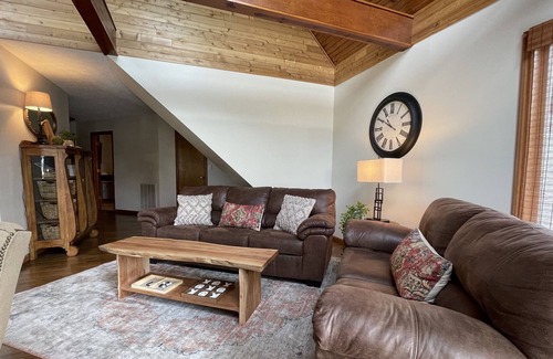 Our family friendly home is a two-story 1,900 square foot home with 2 bedrooms, a loft, sunroom, 2 bathrooms and 2 entertainment spaces. In addition to the living, dining and kitchen, the main floor has sleeping accommodations with the master bedroom (King) and the sunroom with daybed and trundle (2 twins). The main bath with double vanity and large jacuzzi tub and laundry room are also on the main floor. From the loft upstairs enjoy 2 large windows overlooking the neighborhood landing strip and Jonathan Creek. The loft has 2 single beds. Through a door you will find the 2nd bedroom with 2 queen beds, TV and en suite bathroom with shower.