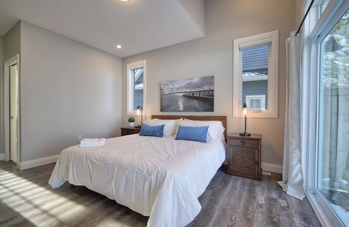 A large, modern wooden island/table in the spacious kitchen will provide you and your group comfort while dining with a view of the beach front. This area flows into the living room with a large TV and more beachfront view that is beautiful in the summer and winter. This chalet also includes 1 loft area, laundry on site, and a kids hangout room in the basement.