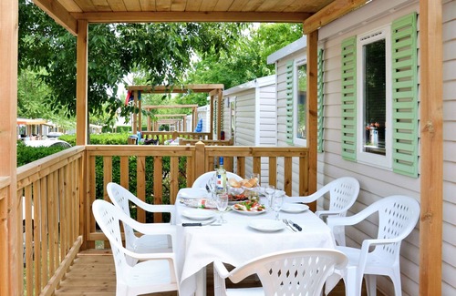 "Happy Premium", 4-room mobile home 30 m2. Comfortable furnishings: living/sleeping room with dining table, electric heating and air conditioning. 1 room with 1 french bed (140 cm, length 190 cm). 2 rooms, each room with 2 beds (70 cm, length 190 cm). Open kitchen (4 hot plates, microwave, freezer, electric coffee machine). Shower/WC. Air-conditioning (extra). Terrace partly roofed. Terrace furniture, electric barbecue (portable), deck chairs (2). Facilities: mosquito net. Parking (1 car). Please note: non-smokers only. IT023006B143AX8QZE