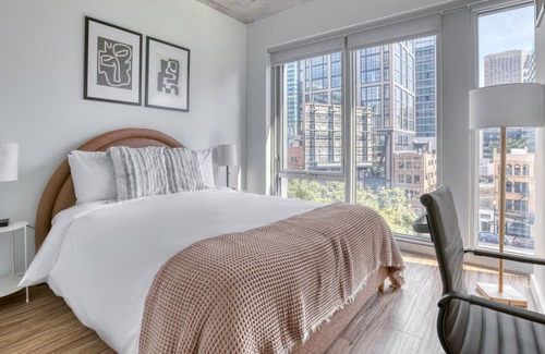 Located in West Loop, this furnished rental invites you to explore the edges of downtown Chicago. From endless dining and bar options to art galleries and stylish shops, West Loop has emerged with so much to offer daily. During weekends, residents savor trips to the Chicago French Market and the vibrant strip of Randolph Street. The latter is known as “Restaurant Row” and is lined with some of the city’s best eateries. Fulton Market, one of the hippest and fastest-growing neighborhoods, is ideal for dinner and drinks. Union Station is only a 5 to 10 minute walk away.