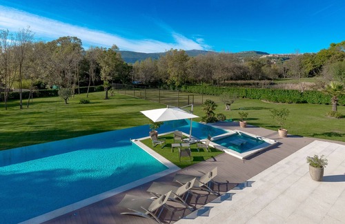 Clos Galissa is a beautiful 6 bedroom property, located in the hills of Chateauneuf, just a few minutes drive from the pretty villages of Valbonne and Mougins, and roughly 30 minutes from the beaches of Cannes. The property is also located just metres from a championship golf course (just 80 meters walking distance from the clubhouse), and moments from a tennis and riding club. Also available for weddings and events.