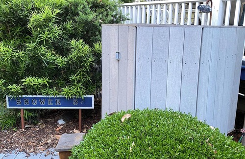 Enjoy outdoor time on the covered porch or the backyard patio which features an outdoor shower and gas grill. (Please note, the fire pit seen in the photos is not operational at this time.)