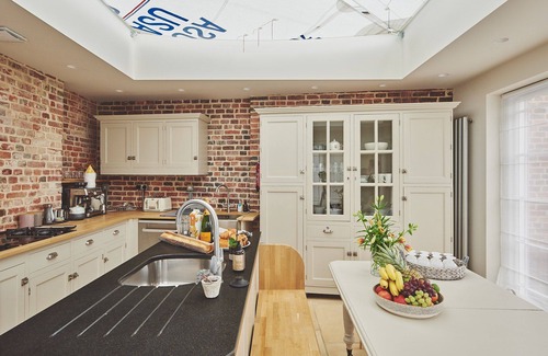 Relax in the sitting room which has an ornamental period fireplace and sofa and armchair seating. Or gather together in the cosy, farmhouse kitchen which features exposed brick walls and a skylight customised with a sail from a boat. There's also an informal dining area and everything you will need to self-cater including an oven, hob, microwave, fridge/freezer, coffee machine, toaster, kettle and dishwasher, plus an Alexa.