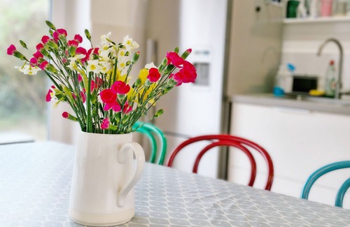 The kitchen is a wonderful place to prepare your meals and the hosts have gone to every trouble to make sure guests can comfortably self cater for their stay in the modern well equipped kitchen includes kettle, toaster, coffee machine, dishwasher, double electric oven and gas hob and microwave. The kitchen is open to a spacious sitting area with large smart TV and a dining area with seating for 8, over looking the sunny mature garden.