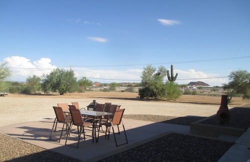 Welcome to this beautifully decorated and newly furnished seasonal vacation rental with room to spread out and enjoy all of what Arizona has to offer. Located in the peaceful area of Queen Creek with great sunsets, night stars, and a beautiful view of the mountains. This 2100 square foot home has 2 bedrooms with queen size beds. There is a den/craft room, along with an office with wireless internet available for longer stays. There is a TV in the family room and den/craft room. The kitchen is fully stocked and remodeled. Washer, dryer, iron and board available. Utilities, TV, and internet are included. Relax on the patio with a glass of wine and some dinner from the gas grill. Then take a nice evening stroll or relax by the firepit. Bring your clothes and toothbrush and stay a while.