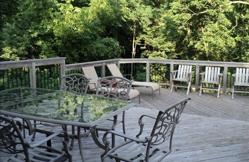 Description: A beautiful cabin style home that is quite unique. It has a large great room with red oak floors and knotty pine cathedral ceilings. The oak wrapped roof beam is more than 17 feet above the floor! A stone, wood burning, fireplace really creates a cozy and romantic atmosphere during the winter months (Don't worry, we provide firewood for your stay during the winter months of Nov-Apr). In addition, a gas furnace will insure that you never get cold.