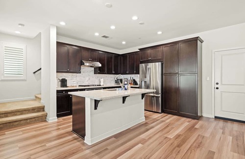 Create culinary magic in the sleek, fully equipped kitchen featuring marble backsplash, dark wood cabinetry, and stainless steel appliances. Whether it’s morning coffee or a full family dinner, everything you need is here.