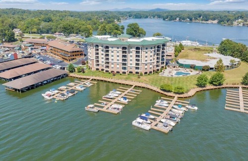 Welcome to your perfect lake escape - a large 4-bedroom (all with king-size beds), 3-bath condo! 2,385 sq ft! Experience stunning views from two lake-facing bedrooms and an open living/dining room. Views from the spacious balcony are perfect for sunrise coffee, post-pool lounging, and nighttime stargazing. Enjoy fast Wi-Fi, Roku TVs, board games and a well-equipped kitchen. Located next to the vibrant Bridgewater Plaza, you'll have walking access to restaurants, shopping, ice cream, coffee, mini golf, boat rentals, and an arcade. The gated community features garage parking, pool access, and day docking for boats available in front of the condo - for overnight docking please call or email for details. Pet-friendly (1 dog allowed, 50lb limit), with all linens and amenities included. This unbeatable main floor (no stairs!) location pairs amazing views with convenience and comfort for the ideal lakeside getaway! 3 night minimum stay. Gas fireplaces available for October - March rentals only.