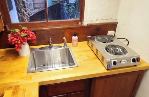 The kitchenette is set up with a commercial 2 burner cooktop, and a basic supply of pots, pans and cooking utinsils.