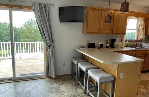 At The Lodge, partake in panoramic views from the upper level deck and lower level patio that span the entire length of The Lodge. Look eastward for sunrises and gaze at the southern Mohawk Valley hills to the south. Both the deck and patio have outdoor tables and chairs, making them ideal for gatherings. Cook outside on two gas grills (one on each level). Have fun on the large playing field, on the swings and at the basketball hoop, and fire pits shared by all guests at Double Play Cabins.