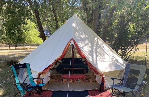 A magical place to camp without the effort of camping. We’ve got everything set up for you, just bring your own food and dishes. The bell tent is furnished with a queen sized bed with a fluffy wool mattress topper, a down comforter and rugs to make it cozy. Next to it is a canopy with a table for four, a table for cooking, propane stove, misc. cooking supplies and solar lights to light it up in the evening. There is also a composting toilet. Relax, wander the land or take day trips in the area.