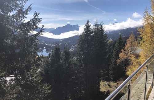57 m2. More information by the provider: Upper of two 3½ -room apartments in a chalet, entrance through the carport, lobby with skiroom and door to bathroom with toilet, bathtub and washing machine, main entrance to the apartment with open loft, two separate bedrooms, a gallery with two beds, living room with fire place, half-open kitchen with large dining table, terrace with chairs and table, open to the garden. The property is at the end of a private road, absolutely quiet and safe for children. Wonderful view over the entire valley, the Valbella-Stätz ski slope can be reached on skis (100m away).