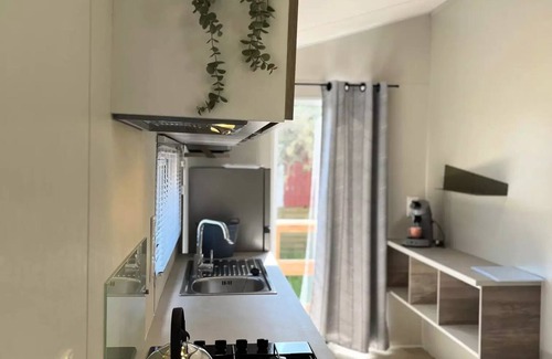 DevelopmentsSpacious living room with sofa, TV.Fitted kitchen comprising: dishwasher, refrigerator with freezer, 4 burner gas hob, hood, filter coffee maker, kettle, full dishware service.1 bedroom with 1 bed (160 x200), storage1 bedroom with 2 beds (80 x190), storage1 shower room, washbasin, storage, towel dryer1 separate toiletSemi-covered terrace with wooden garden furniture 4 people and wooden bench.Practical informationEach bed has a mattress cover, a duvet and a 60/60 pillow.