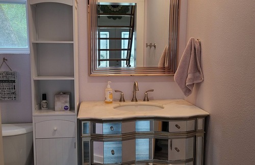 Located on our 4.26acre homestead. The loft sleeping area has 2 queen beds. Fully equipped kitchen with fridge/freezer, microwave and a 2burner cooktop make meal preparations a breeze or bring your favorite meal to grill in the outdoor kitchen area. equipped with a SS grill, sink, and ice maker. Beautiful oversized walk-in shower in the bathroom, and a quaint living area for relaxing or work from the sofa at the pop-up coffee table. The sofa lays down into a comfortable bed if you don't want to climb the stairs after a long day of "relaxing".