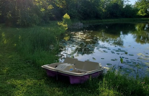 A rural home about 15 min from town, featuring a lower level, one bedroom apartment with a King size, memory foam bed, full bathroom, kitchen, and washer/ dryer. Living room in the suite has a futon available for more to sleep there. Weather permitting the pool and grill are available to use, as well as several pieces of play equipment for the kids. Feel free to fish in the pond for bluegill and catfish and warm by the fire at the fire pit. There are goats and chickens on site to enjoy as well.